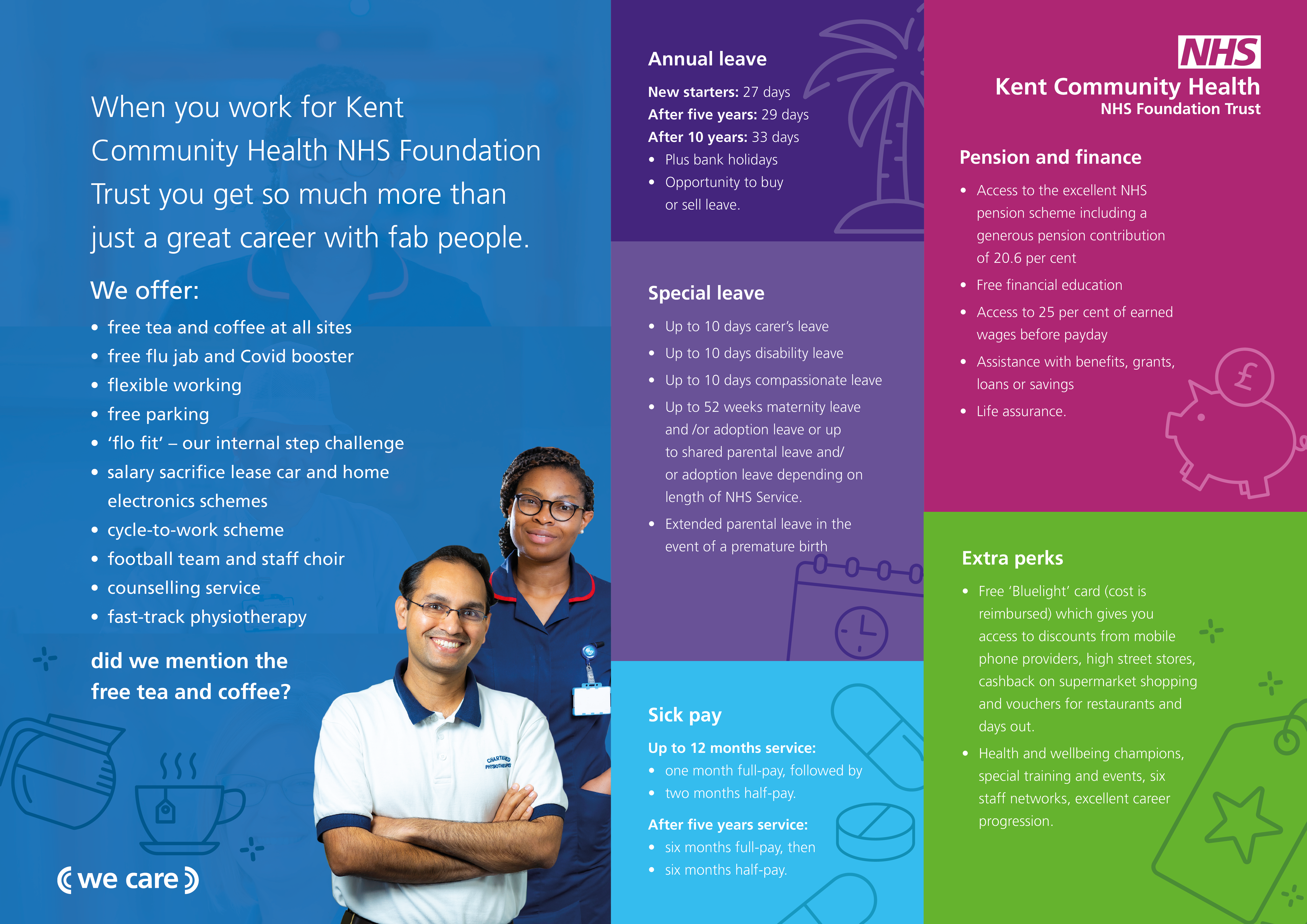 Wherever you work and whatever your role, as a KCHFT colleague you can enjoy a number of benefits including a free flu jab, a salary sacrifice car lease scheme, cycle-to-work, access to a counselling service and fast-track physio. A number of Kent fitness centres offer us exclusive NHS deals – you could save a few pennies!