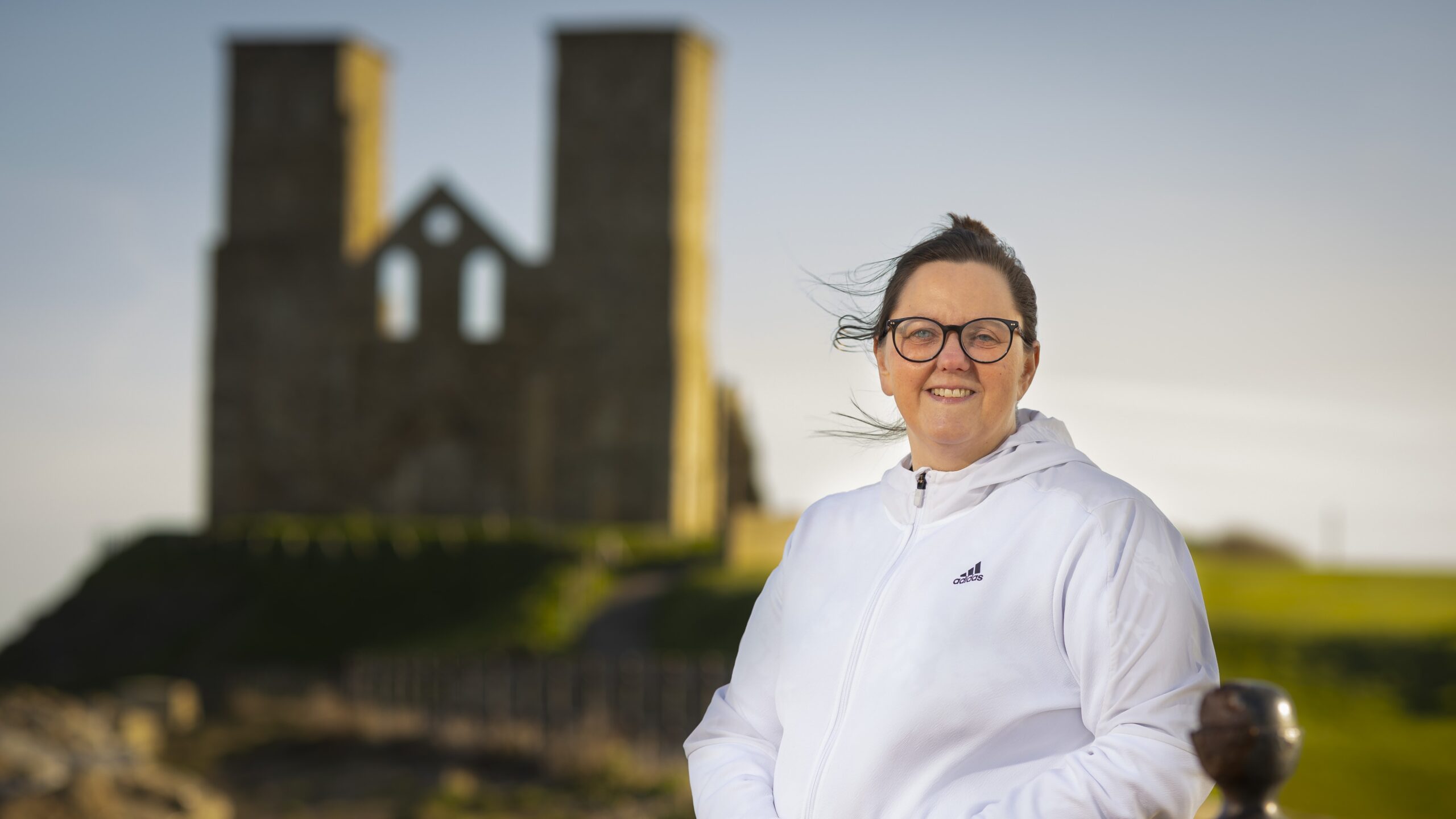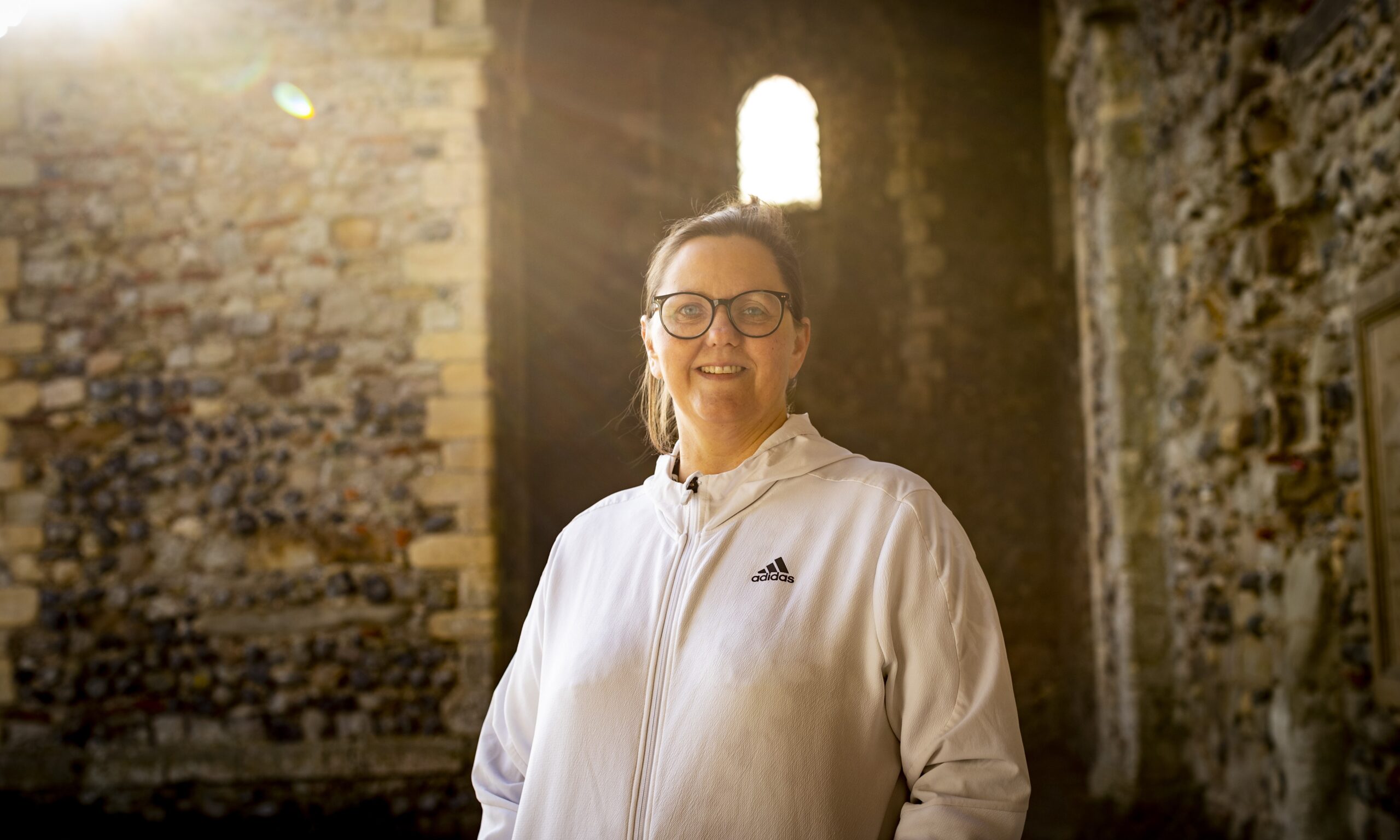 “Ultimately, I want to get back to running multiple times a week – for my physical and mental health. I have some great friends who have been with me every step of the way during my recovery and I can’t wait to get out pounding the tarmac with them again.”Emma smiling at the camera inside Reculver Towers