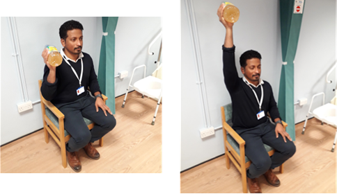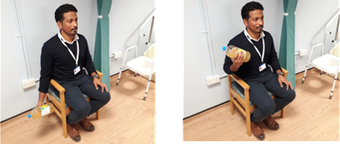 - Sitting in your chair hold a water bottle in your hand at shoulder level.